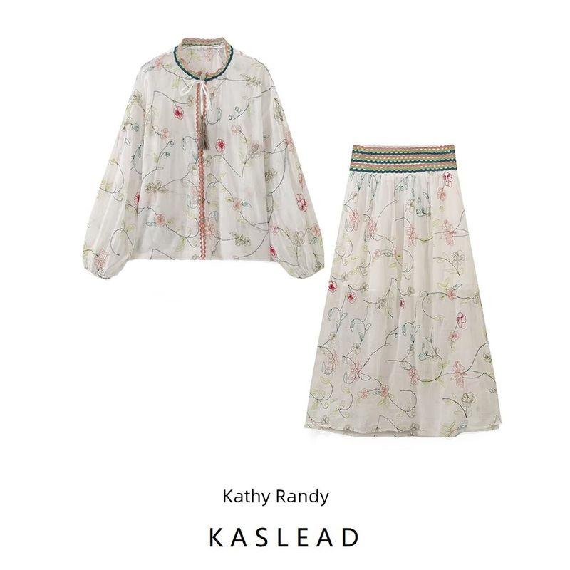 Kaslead New Arrival Women's Fashion Style Flower Embroider Shirt Casual Skirt Suit 5770537