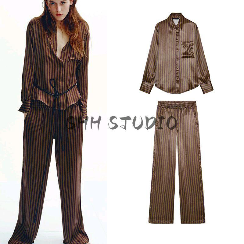 Spring New Women's Clothing Casual Pants 2298425 Stripes Print Silk Satin Textured Shirt 2298056