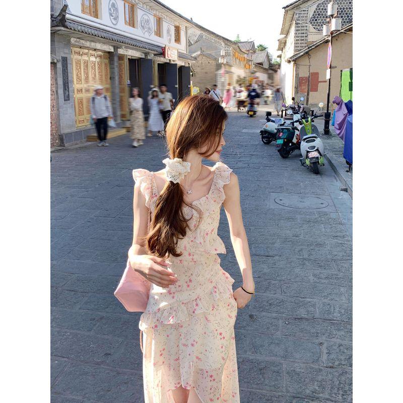 Kumikumi Holiday Style Floral Small Flying Sleeves Dress Women Summer Irregular Design Slimming Fairy Skirts