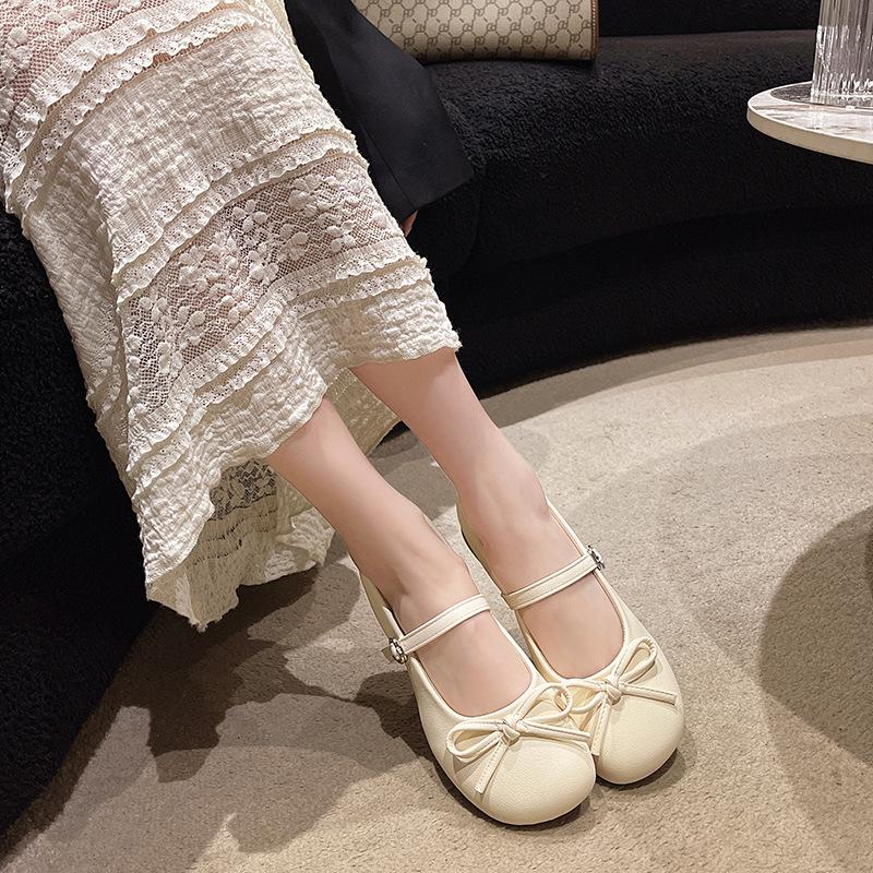 Gentle French Bow Round Head Mary Jane Single Shoes Women's 2025 Spring and Summer New Low Heel Comfortable Commuting Small Leather Shoes