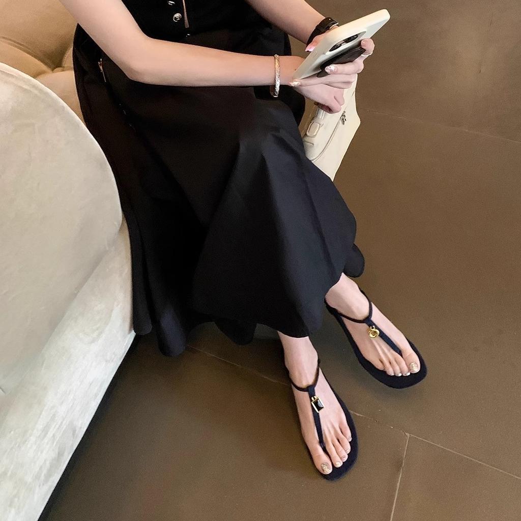 Su Yinyin Has the Same Retro Mandarin Duck Design Gold Buckle T with Toe Flat Sandals Women's Round Head Versatile Open-toed Sandals