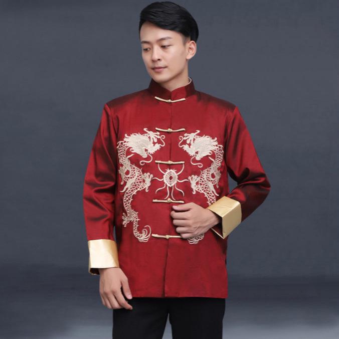 Elevate your festive wardrobe with this stunning long sleeve Tang suit jacket, crafted from luxurious satin. Featuring a striking bright red color, the jacket is embellished with an intricately embroidered dragon design, capturing the essence of traditional elegance. Its stand collar and double-layer construction offer a refined touch, while the open front design ensures a comfortable fit. Perfect for New Year performances or any occasion that calls for a bold, retro-inspired statement, this jacket seamlessly combines tradition with contemporary style.