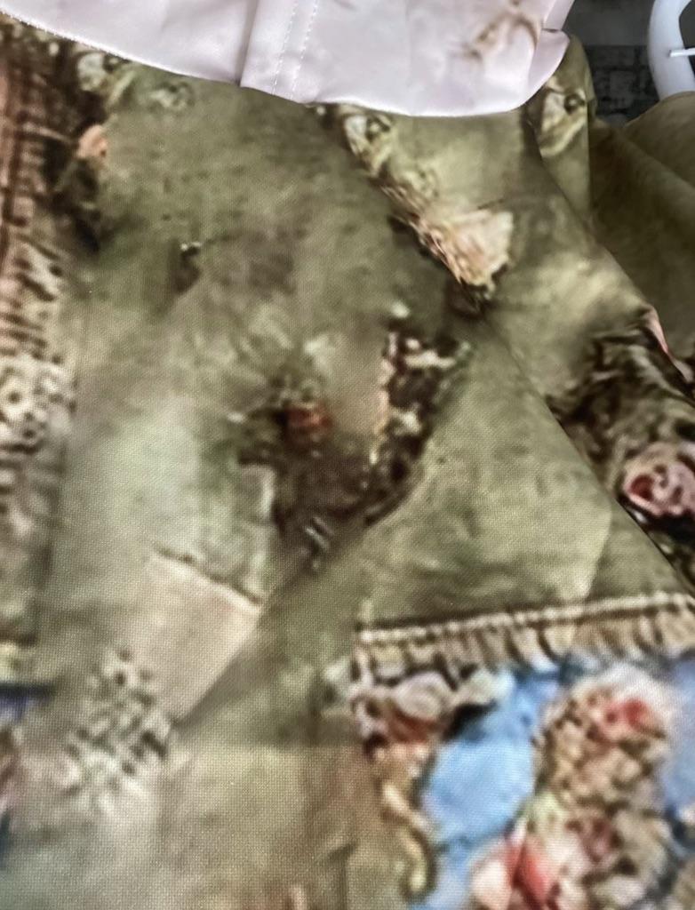 The photo on the card is misleading, it's just a floral blurred print on the sweatshirt, although what did I expect for that price(((