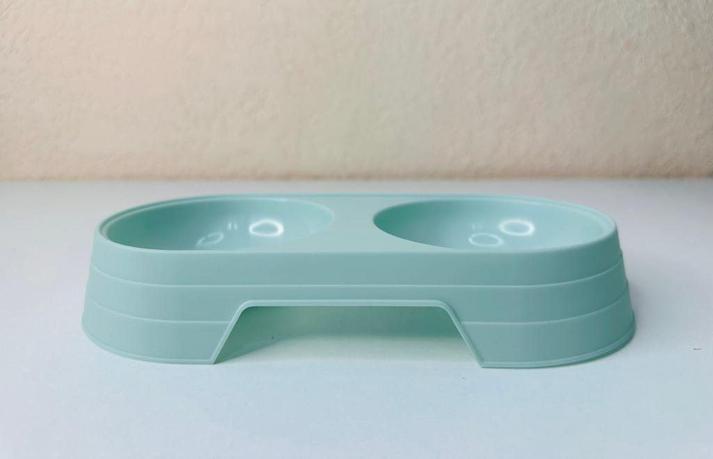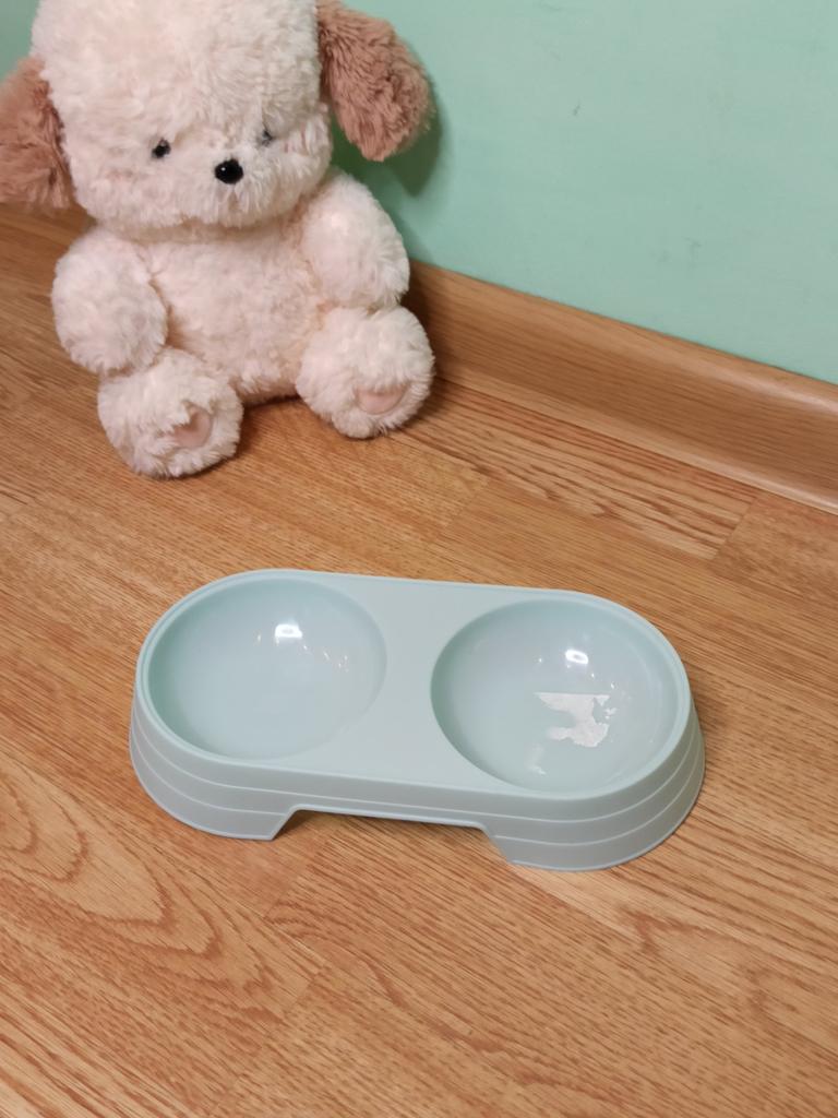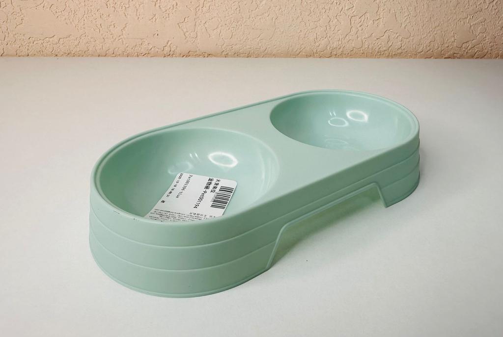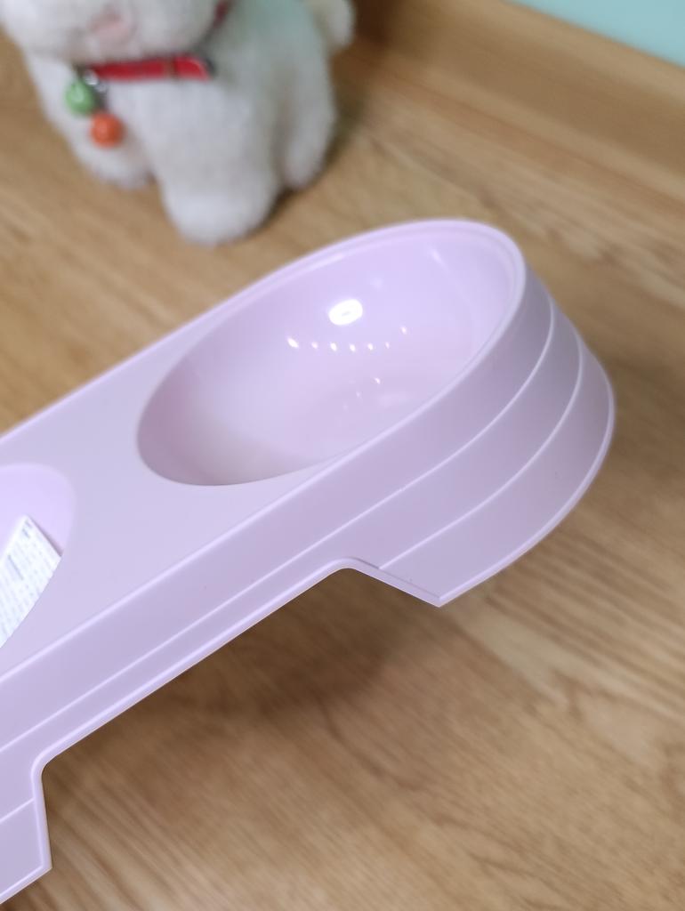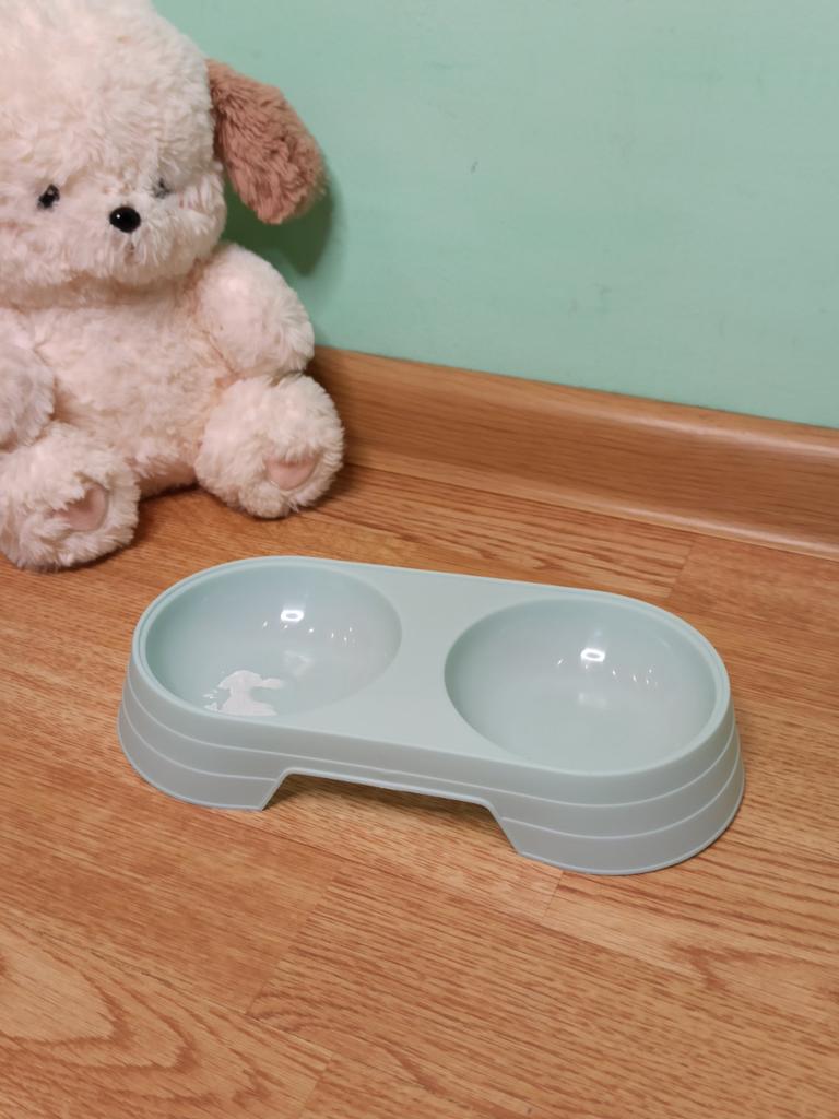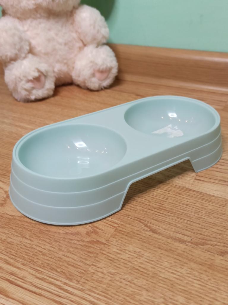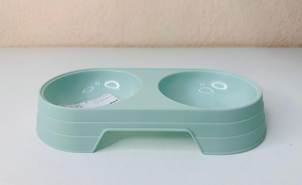 Double pet bowls are used to hold food and water simultaneously. Type: Double bowls, ideal for cats or small dogs. Material: Made of plastic. Colors: Available in various pastel colors, including orange, purple, mint green, and light yellow. Purpose: A convenient feeding solution that allows you to keep food and water in one place. I recommend.👍