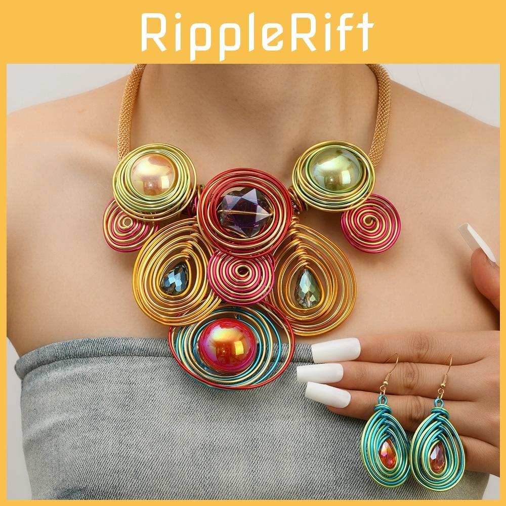 This jewelry set features a large, handcrafted necklace and earrings crafted from plastic and resin with electroplated finishes for durability. The water wave chain measures approximately 18 inches in length, with acrylic floral-themed pendants in vibrant gold or silver hues, accented by geometric patterns. Designed for versatile wear, it suits casual or fashionable occasions during the winter season. The set is easy to maintainsimply wipe clean with a damp cloth to preserve its vibrant appearance.
