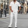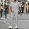 Introducing a stylish and versatile two-piece set perfect for the warmer months. This ensemble includes a short-sleeve shirt and long pants crafted from a comfortable cotton blend, ensuring a soft and breathable feel. The solid color design offers a clean and modern aesthetic, complemented by the convenient button pocket on the shirt. Ideal for casual outings or relaxed gatherings, this set combines functionality with contemporary style, making it a must-have addition to your summer wardrobe for 2025.