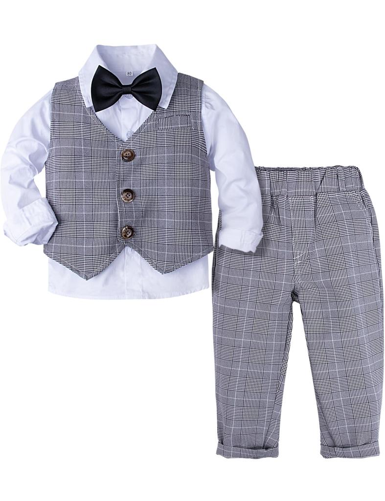 This 4-piece set includes a long-sleeved shirt, pants, vest, and bow tie. Comfortable and stylish, it'll transform even the most mischievous kids into gentlemen!