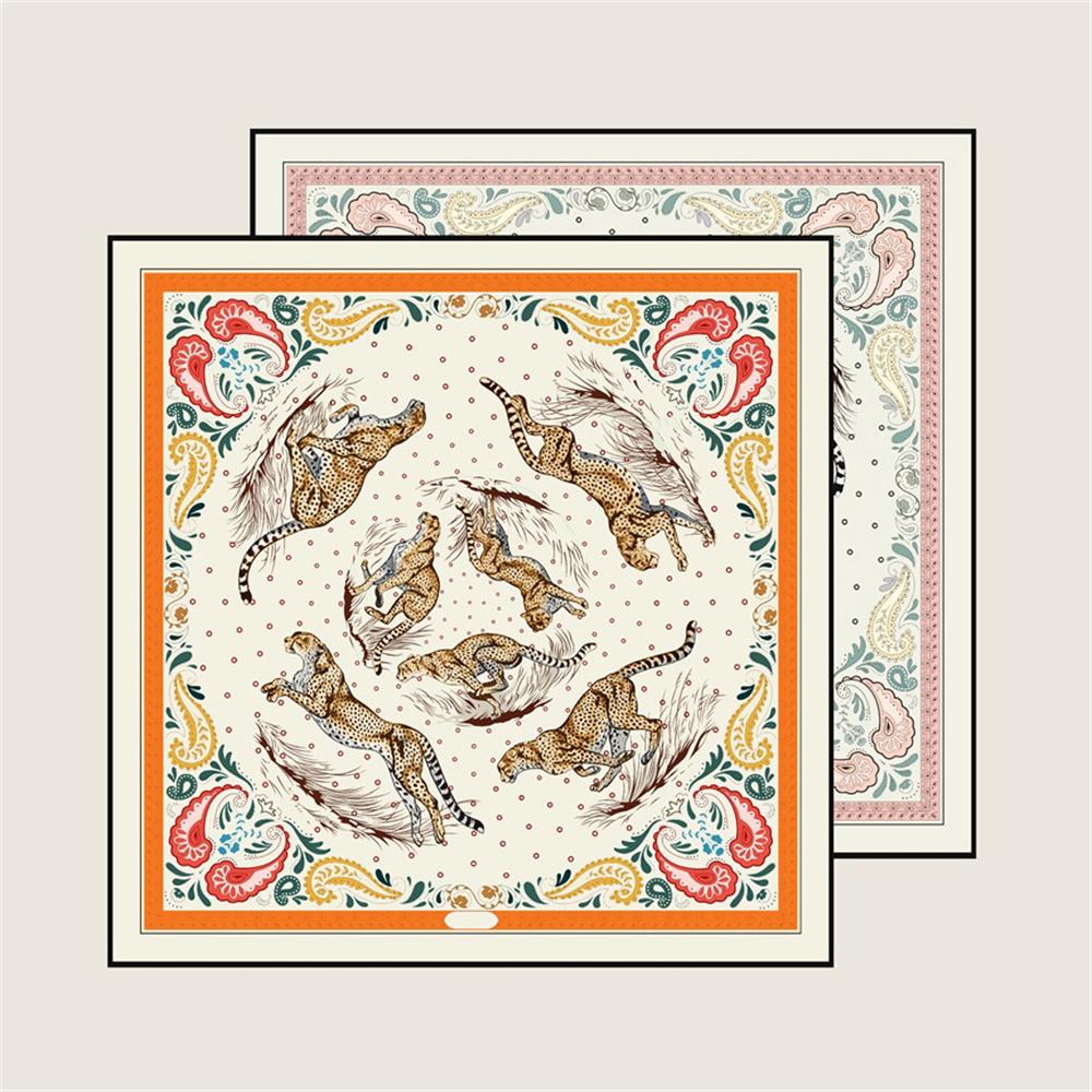 POBING Manual Hand Rolled Twill Silk Scarf Women Leopard Double Print Square Scarves Wraps Echarpes Foulards Femme Hijab 90CM