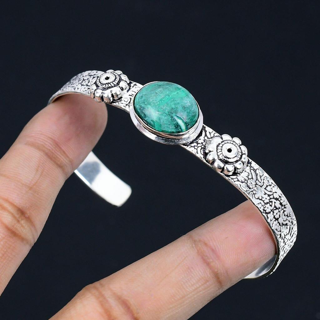Natural Malachite Gemstone Bangle Adjustable 925 Sterling Silver For Girls