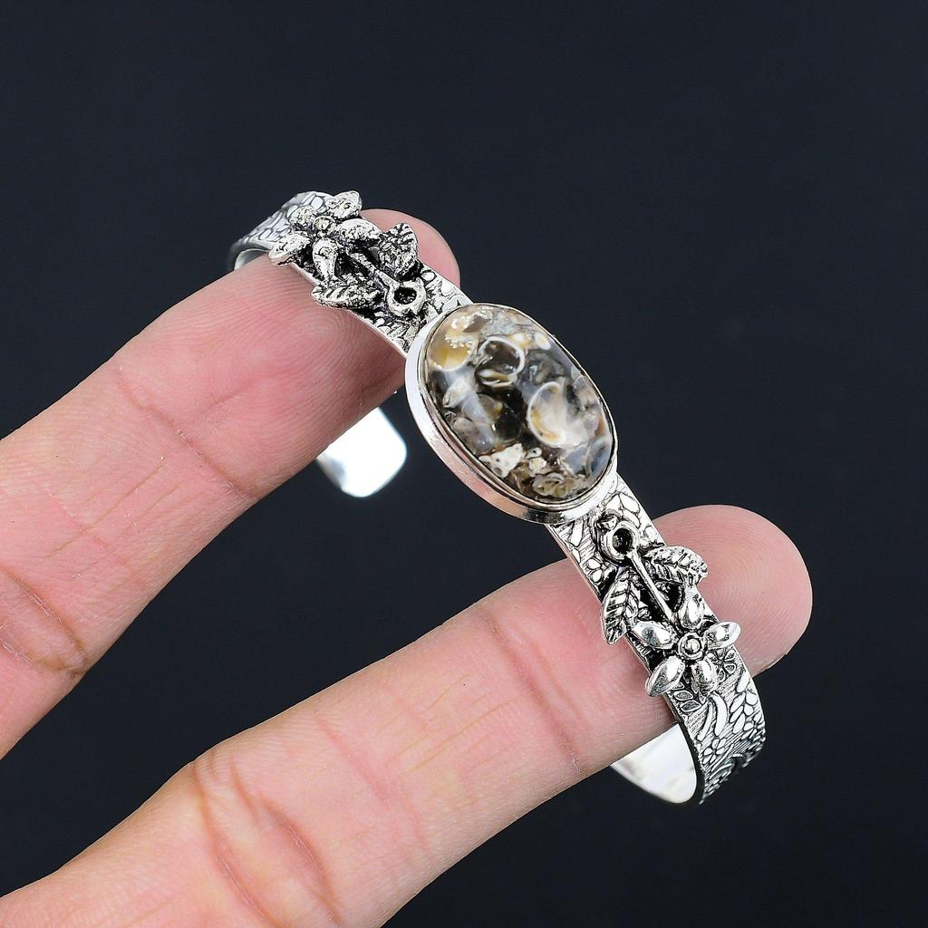 925 Silver Oval Natural Turritella Agate Flower Handcrafted New Bangle Bracelet