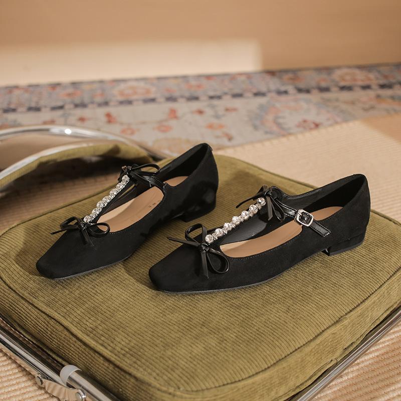22305 Flat Shoes Women's Thick Heel 2025 New Square Head Rhinestone Word with Mary Jane Bow Single Shoes
