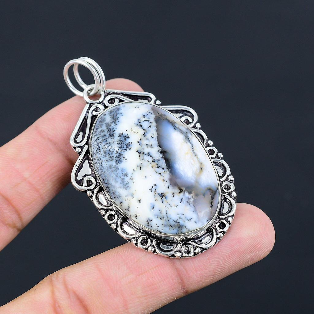 Oval Natural Dendrite Opal 925 Silver Sister Bezel Art Deco Boho Pendant Jewelry