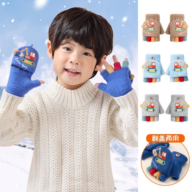 Autumn and Winter Half Finger Flip Dew Finger Knitting Kindergarten Boy Thickened Warm Winter Cartoon Wool Children's Gloves
