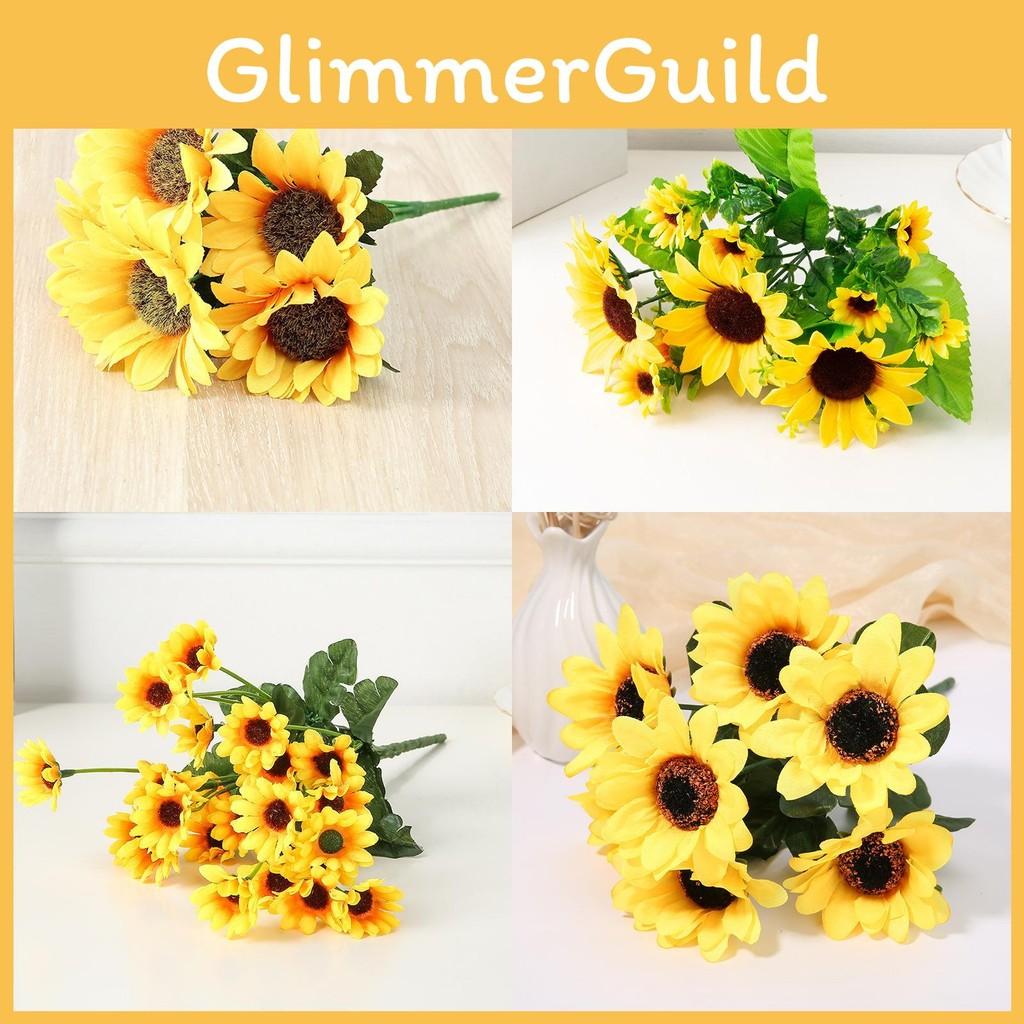 This artificial sunflower bouquet, crafted from durable silk flower material, features vibrant sunflowers in varieties including seven-head, thirteen-head, and twenty-four-head designs. The flowers are shaped with precision through molding and shaping techniques, ensuring realistic appearance.
