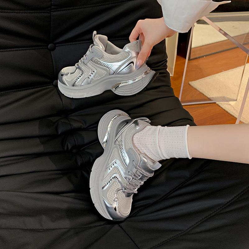 Silver Dad Shoes Women's 2025 New Spring and Autumn Mesh Breathable Thick Sole Heightening Soft Sole Not Tired Feet Casual Sports Shoes