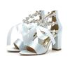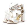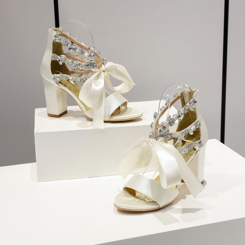 European and American Large Size One-word with Thick Heel Women's Sandals Satin Rhinestone High Heel Lace-up Bow White Rhinestone Women's Shoes 43
