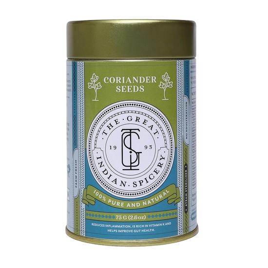 The Great Indian Spicery Coriander Seeds (Dhaniya Beej) are 100% pure, natural, and farm-fresh, carefully steam-sterilized to retain their aroma, flavor, and nutrients. Packed in a 75gm tin, these non-adulterated seeds are perfect for seasoning, cooking, and enhancing the taste of your favorite dishes.
