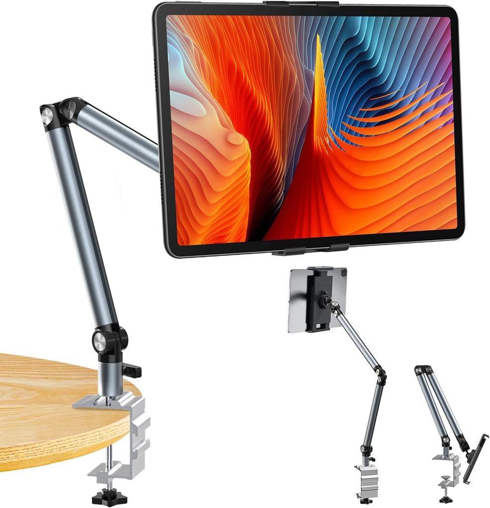[4-joint arm for freely adjustable height and angle] This state-of-the-art tablet/smartphone stand features four joints, two sturdy aluminum arms, and a stable base, ensuring durability, stability, and convenience. The tablet holder uses a ball joint to connect, allowing you to freely adjust the angle and orientation. The 360° rotating ball head and main arm provide a full viewing angle. It folds up for storage when not in use. The two-stage arm is made of durable aluminum and can withstand heavy loads.