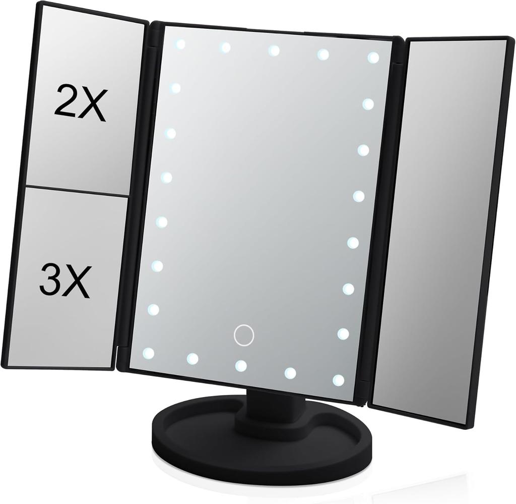 Foldable, three-way tabletop mirror with adjustable angle, 2x & 3x magnification, and stepless dimming