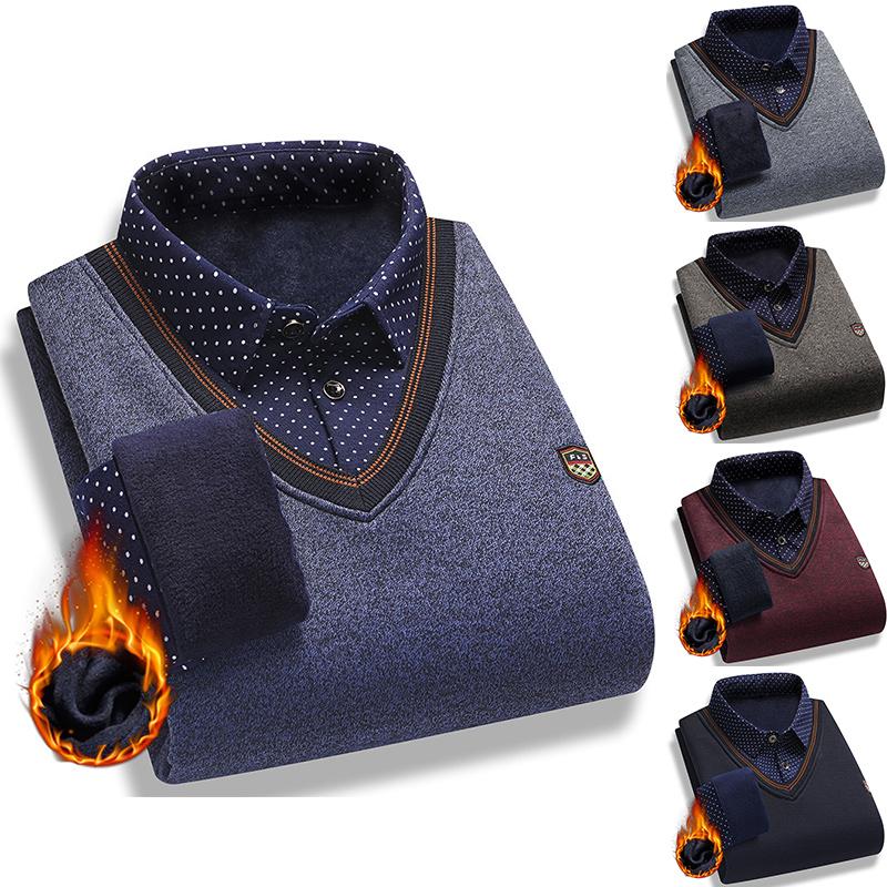 L-4XL Autumn and Winter New Fake Two Piece Sweater Men's Plush Knitted Warm Inner Wear Casual Versatile Pullover Top