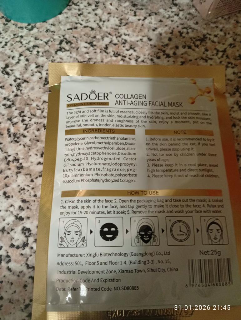 * Sheet mask for the face * ⭐⭐⭐⭐⭐ 💥𝗟𝗶𝗲𝗳𝗲𝗿𝘇𝗲𝗶𝘁 18 days 💥𝗟𝗶𝗲𝗳𝗲𝗿𝘂𝗺𝗳𝗮𝗻𝗴 Included in the delivery were 5 packs of sheet masks, each with a content of 25 g. The following quantities are available to order: 1 piece, 3 pieces or 5 pieces. The whole thing was packaged in bubble wrap and arrived safely and sound at my place.. I must say just the packaging alone looks very high-quality, I like it very much 💥𝗤𝘂𝗮𝗹𝗶𝘁ä𝘁 This is a cloth mask for the face with intense nourishing care good for the skin. The cloth has a light and soft film is full of nourishing essences. The cloth lies close to the skin, is supposed to moisturize and smooth it.. This should improve the dryness and roughness of the skin... smooth, delicate and elastic... APPLICATION: 1. Cleanse the skin of the face: 2. Open the packaging bag and take out the mask; remove the plastic film from the fleece film, 3. Unfold the mask, apply it to the face, and gently pat it so that it adheres closely to the face.; 4. Relax and let the cloth act for 15–20 minutes ; 5. Take off the mask and wash your face with water. NOTES: 1. Before use, it is recommended to try it on the skin behind the ear... if it doesn't feel good or causes irritation, you should not continue to use it. 2. Not suitable for children under three years old 3. Please store it in a cool place, avoid it high temperatures and direct sunlight; 4. Please keep it out of the reach of children. I am totally thrilled how good my skin felt afterwards. It was definitely very well moisturized.. Features: 🌟Rich 🌟Provides deep hydration and locks in long-lasting moisture 🌟 Gives rough, dry skin a supple moisture 🌟 Skin becomes softer and smoother 💥𝗙𝗮𝘇𝗶𝘁 Even though I was initially irritated by how much moisture was in the sheet mask, it felt beautifully cooling and pleasant on the skin. I had no skin irritations whatsoever and enjoyed a little wellness at home with this sheet mask. The application is very simple 👍 I would recommend the product without reservation ⭐⭐⭐⭐⭐