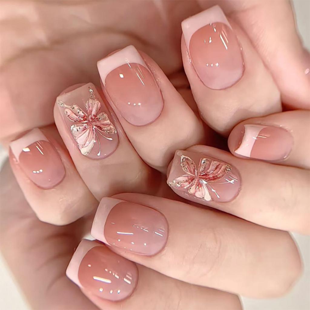 24 Pcs French Tip Press On Nail Short Square False Nail 3D Flowers Acrylic Nail Glossy Full Cover Stick On Nail