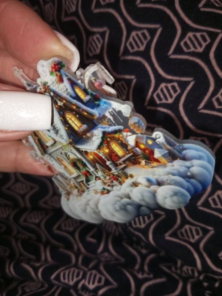 Add a touch of charm to your Christmas decor with our Christmas pendant. Crafted from high-quality acrylic, this durable decoration features a realistic design of a snow-covered cabin adorned with festive elements. Hang it on your Christmas tree, mantel, or even your backpack for a unique artistic touch.