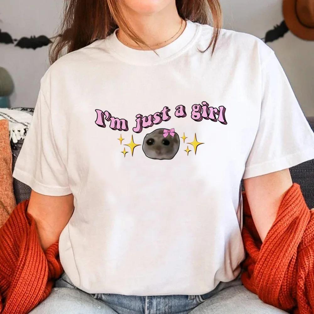 24ss Girls Funny T-shirt Sad Hamster Graphic Print Clothing I'm Just A Girl Letter Tops Humour Patterns Streetwear White Blouse