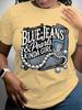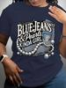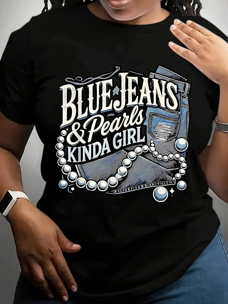 Plus Size Blue Jeans & Pearls Women'S T-Shirts Fashion T-Shirts Tops Shirts Round Neck for Daily Wear Y2k Clothes