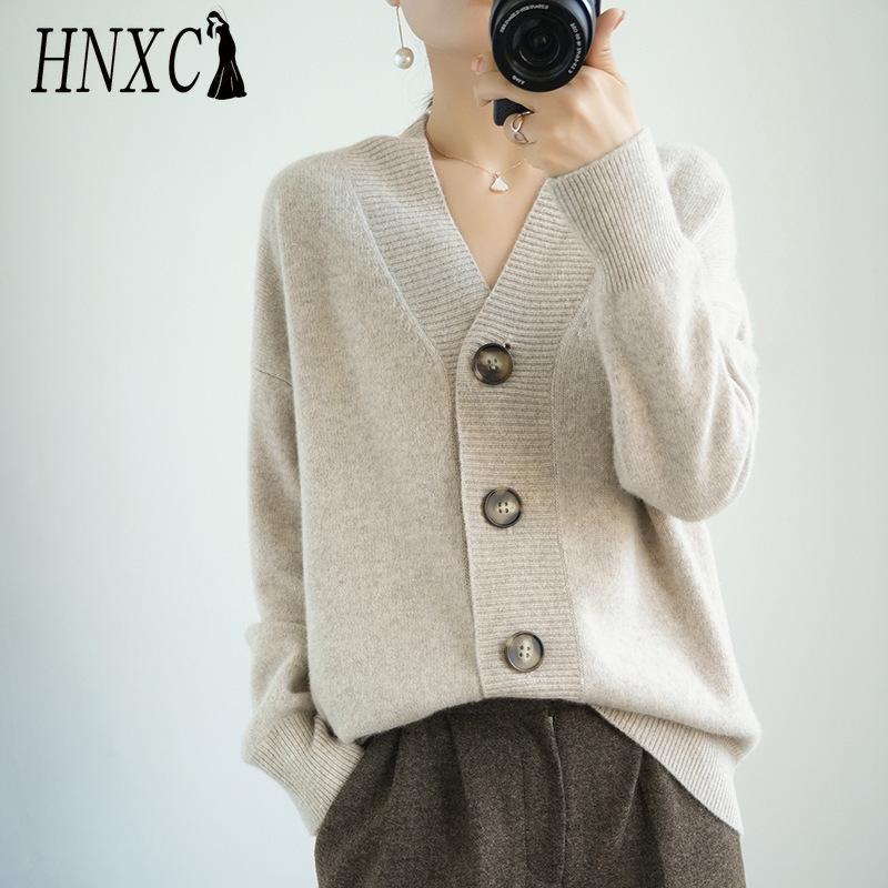 HNXC Spring and Autumn Knitted Sweater, Loose Large-sized Cardigan, Women's Collar Knitted Sweater, Solid Color Button, Laid-back Coat