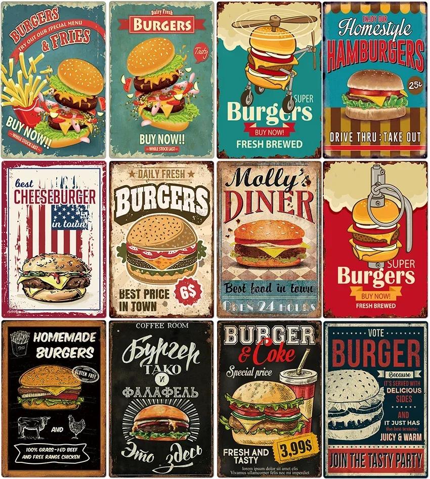Delicious Hamburger Food Signs Metal Plaques Barbecue Kitchen Restaurant Shop Tin Sign Decorative Posters Retro Iron Painting