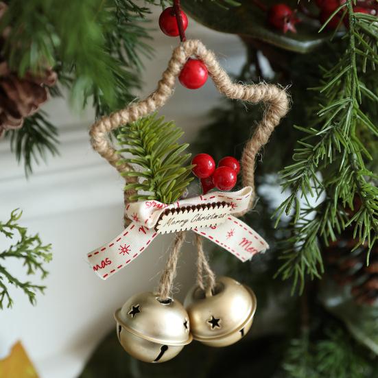 Christmas Jingle Bell Rustic Iron Door Hanging Star Bell with Bow Pine Picks Red Berry for Christmas Wreath Gift Wrapping Craft Home Decor