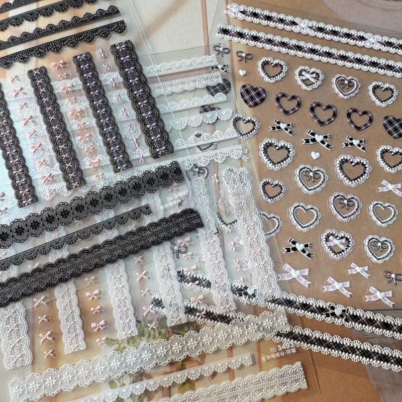 3 Pcs/set Pink Black Color Kawaii Nail Stickers Lace Bow 3D Checkered Scrapbook Journal Sweet Edgy Design Decal for Girl