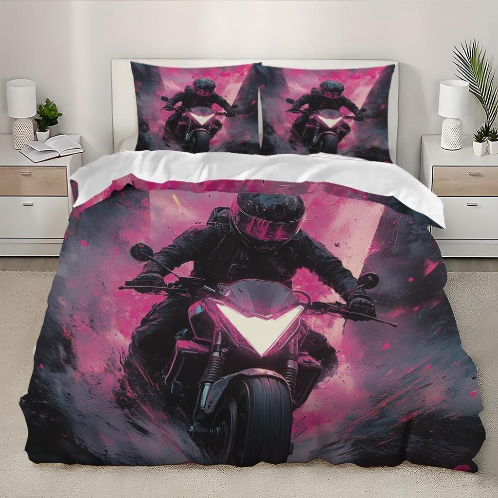 Motorcycle Pattern Bedding Set, Motorbike Comforter Cover for Kids Boys Teens Extreme Sports Theme Duvet Cover Set with Zip