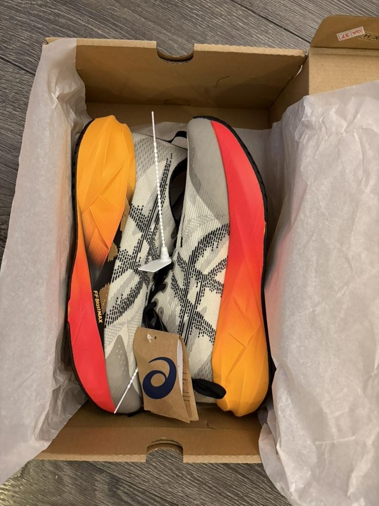 The shoes arrived fairly quick, in perfect condition and had that fresh scent of new shoes. The box was also in perfect condition. Since I have a few Asics Novablast shoes myself, I can confirm that these are original. As usual they are very comfortable and give you the "walking on clouds" feeling.