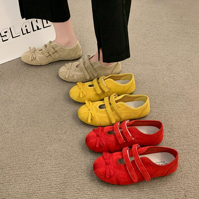 2025 Spring and Autumn New Flat Bottom Solid Color Casual Shoes Matte Bow Velcro Comfortable Soft Sole German Training Shoes Women