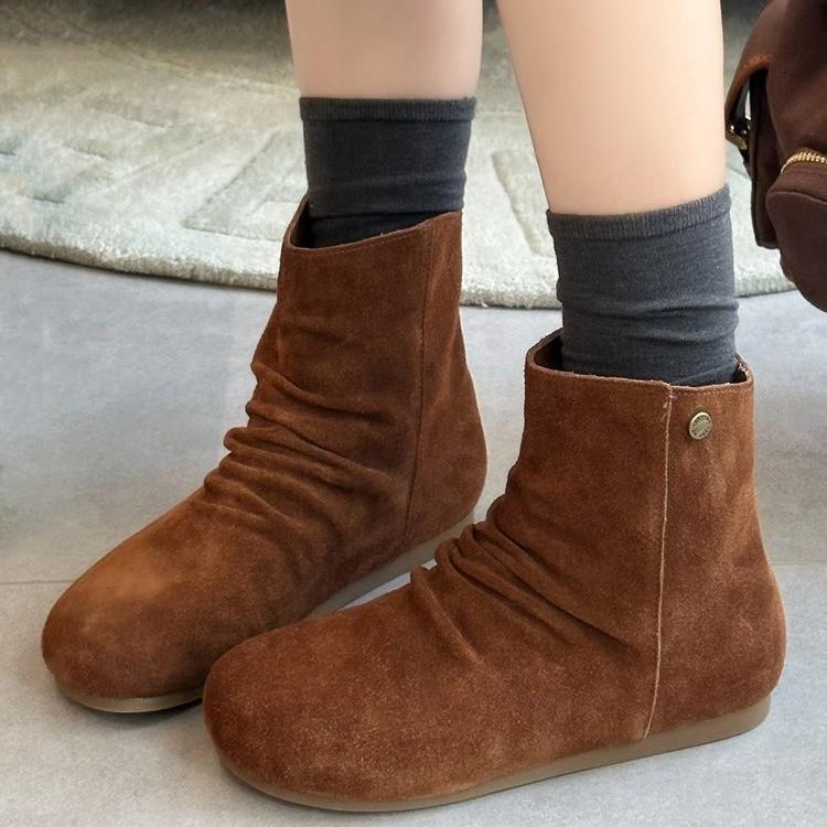 Cowhide Version~ Retro Style New Pleated Matte Leather Inner Height Increase Western Boots Women's Versatile Round Head Looks Thin