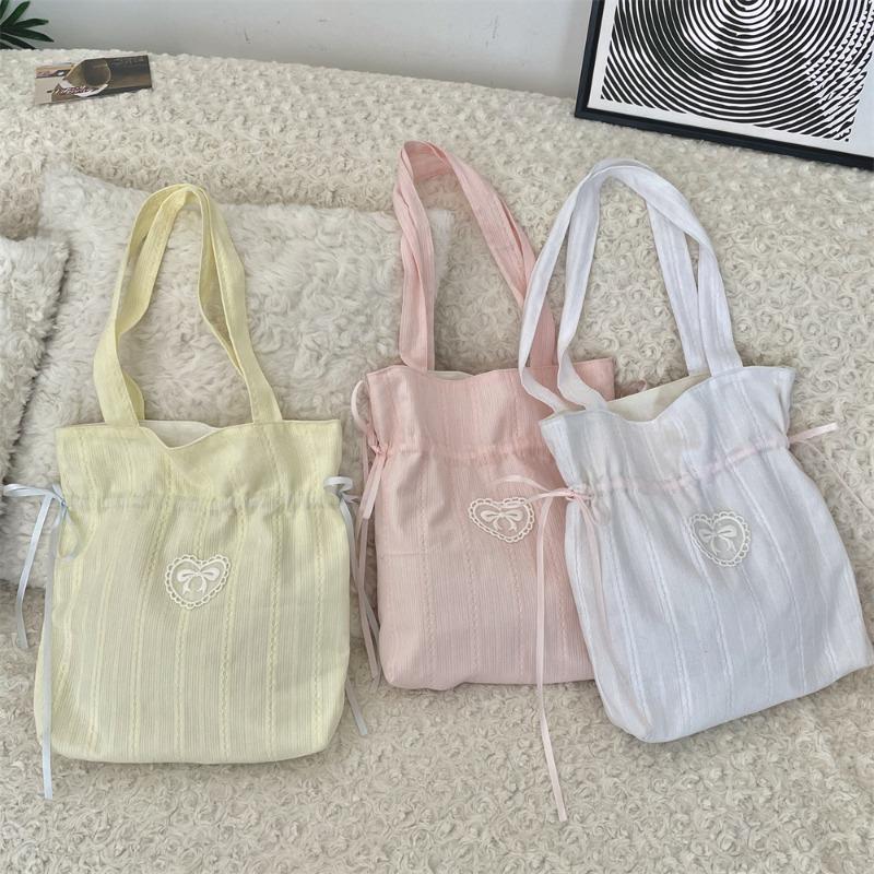 3 Girls Heart Bow Shoulder Bag Drawstring Bundle Canvas Bag Fresh Handbag Women's Shopping Bag