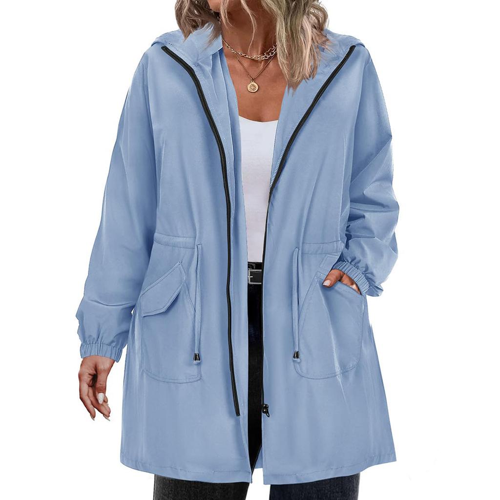Womens Raincoats With Hood Lightweight Outdoor Hooded Solid Trench Coat Jacket Plus Size