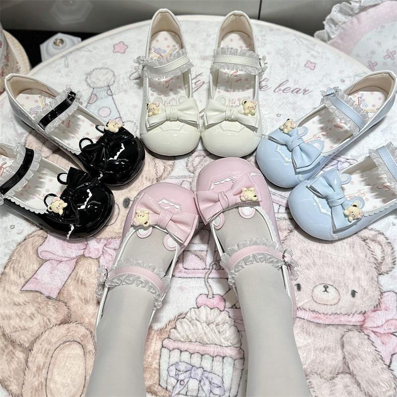 Campus Wind Sweet Pink Lo Shoes Japanese Round Head Single Shoes Women's Bow Summer Cute Cute One-word Buckle Leather Shoes