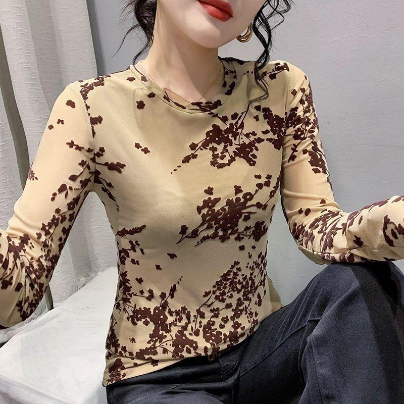 Large-sized Spring Autumn Women's Clothing Round Neck Pullover Long Sleeve Plant&Flowers T-shirt Casual Vintage Comfortable Office Lady Tops