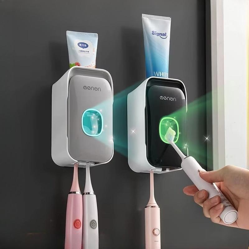 HOMZY Automatic Toothpaste Dispenser Wall-Mounted Bathroom Toothpaste Squeezer Punch-Free Toothbrush Holder Rack Bathroom Acces
