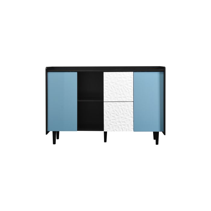 Armoire De Rangement Noire Avec Portes Bleues, Dotée De Deux Tiroirs Au Style Unique Et De Deux Compartiments De Rangement Ouverts.