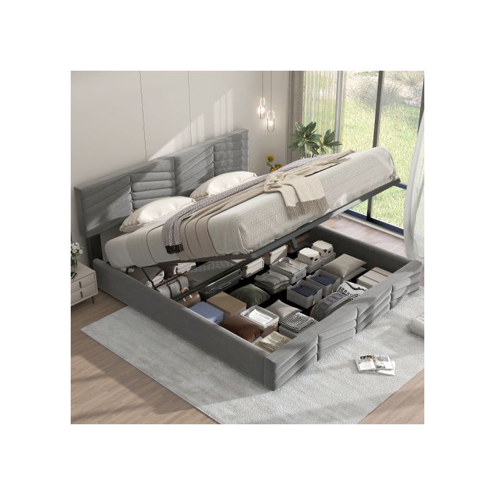 Lit Rembourré - MUVOE - 180 X 200 - Tête De Lit Réglable - Fonction De Stockage - Style Rayé