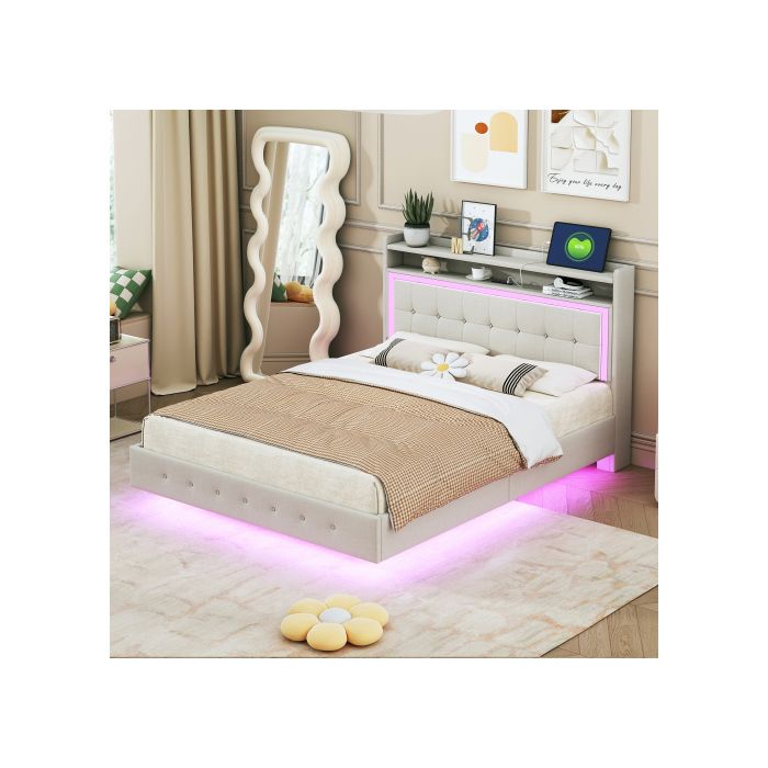 Lit Rembourré - MUVOE - 140x200 Cm - Prise USB - Éclairage LED - Tissu Lin Beige