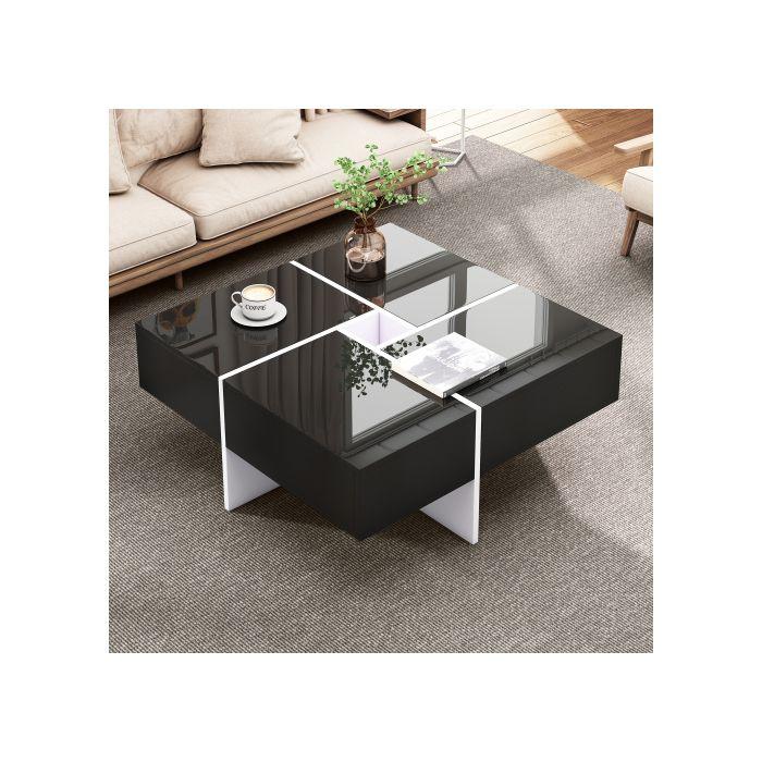 Table Basse Élégante Et Brillante 70*70*35 Cm, Design Noir Et Blanc, Compartiment De Rangement Intégré Et 4 Tiroirs Robustes