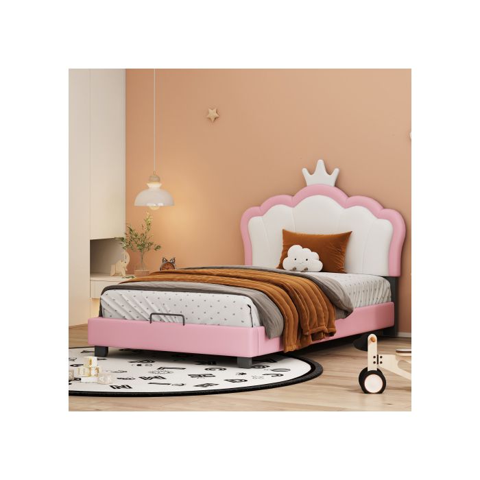 Lit Enfant - MUVOE - 90x200 Cm - Rose - Sommier À Lattes - Dossier En Forme De Couronne