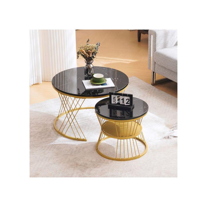 Lot de 2 tables basses brillantes, tables rondes gigognes côté canapé, finition marbre, lot de 2, structure dorée