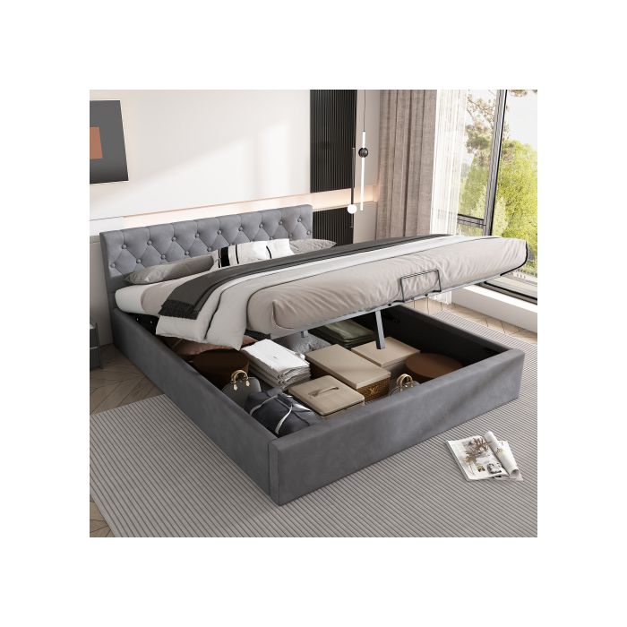 Lit - MUVOE - 140x200 Cm - Velours Gris - Tête De Lit Boutonnée - Rangement Hydraulique