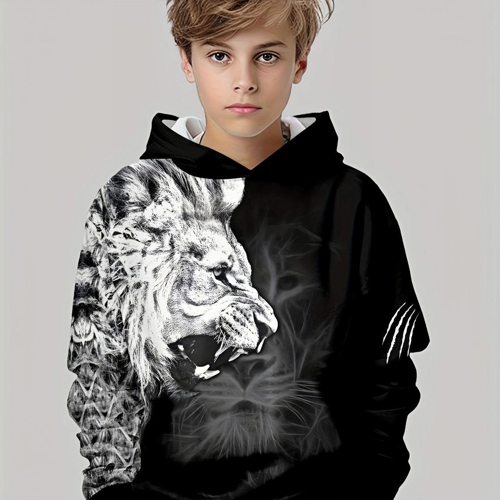 Boys' 3D Printed Hooded Sweatshirt - Black and White Contrasting Pattern Pullover, Long Sleeved Outdoor Sweatshirt